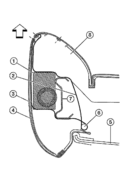 - Make sure the side air bag outer chute (3) is pulled over the side air bag module (1) and the side air bag inner chute (2) is pulled around the frame (7). Make sure there are no wrinkles and the chutes are not folded, twisted or pinched.