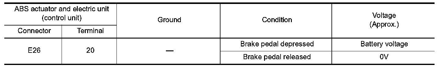 3.Check voltage between ABS actuator and electric unit (control unit) connector E26 terminal 20 and ground.