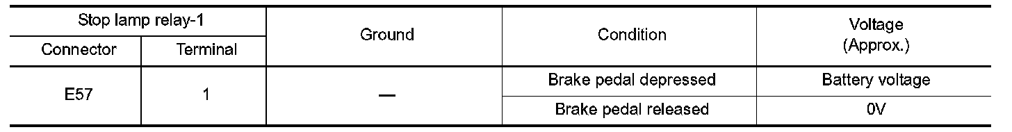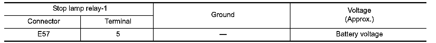 Check voltage between stop lamp relay-1 connector E57 terminal 5 and ground.