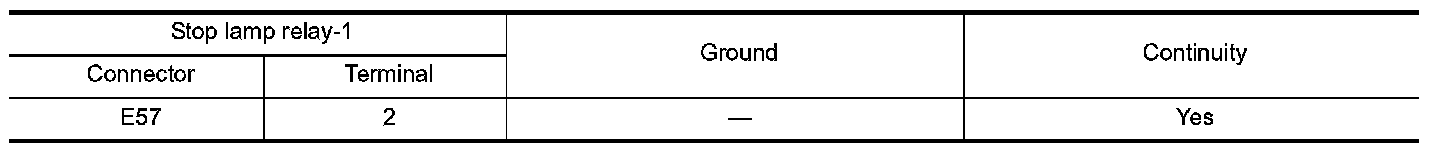 Check continuity between stop lamp relay-1 connector E57 terminal 2 and ground.