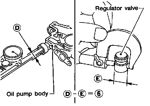 (Regulator valve to oil pump cover clearance) = D (Valve hole diameter) - E (Outer diameter of valve)