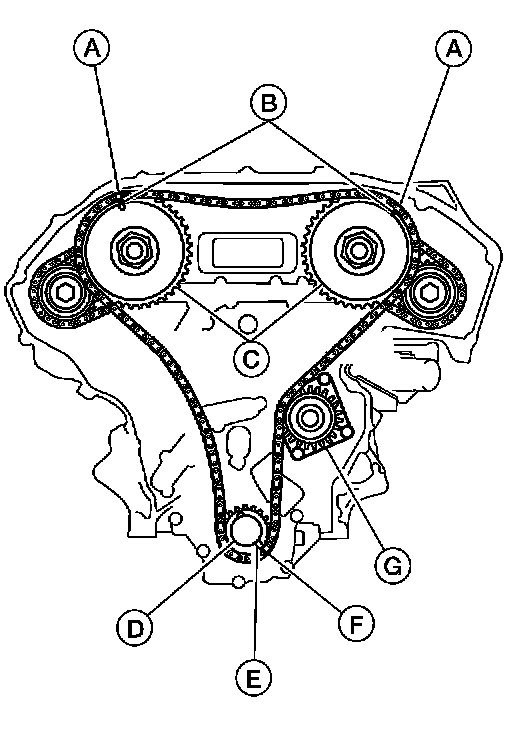- Install primary timing chain so the mating mark (punched) (B) on camshaft sprocket (C) is aligned with the pink link (A) on the timing chain, while the mating mark (notched) (E) on the crankshaft sprocket (D) is aligned with the orange one (F) on the timing chain, as shown.