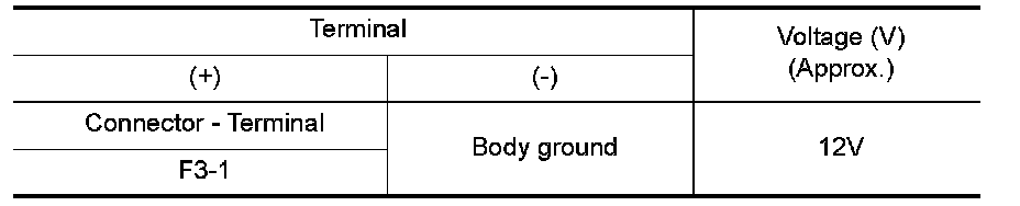 3.Check voltage between A/C compressor harness connector F3 terminal 1 and ground.