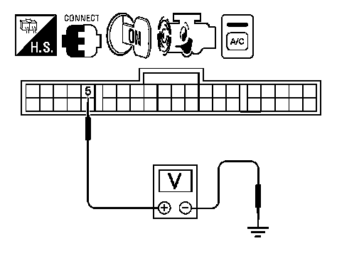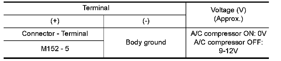 Check voltage between front air control connector M152 terminal 5 and ground, with A/C compressor ON and with A/C compressor