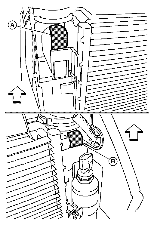 6.Depress the top RH clip (A) and the top LH clip (B) to release the top condenser brackets as shown.