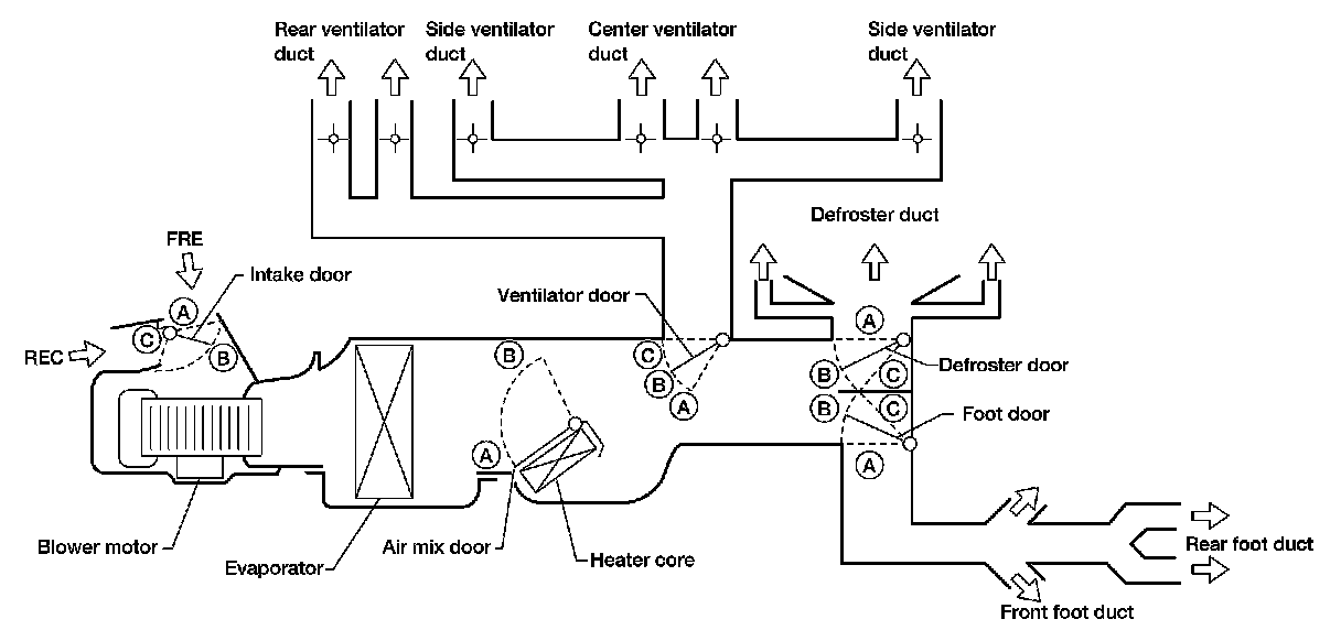 - Data sent from the front air control are selected according to data-based decisions made by the mode door motor, air mix door motors and intake door motor.