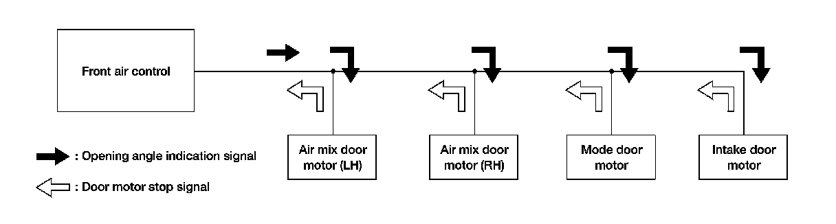 The mode door motor, air mix door motors and intake door motor read their respective signals according to the address signal. Opening angle indication signals received from the front air control and each of the motor position sensors is compared by the LCUs in each door motor with the existing decision and opening angles. Subsequently, HOT/COLD, DEF/VENT and FRE/REC operation is selected. The new selection data is returned to the front air control.