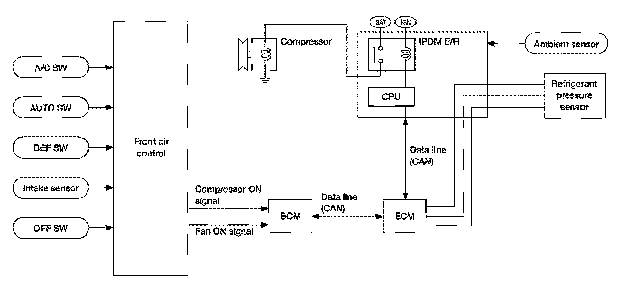 When sending compressor ON signal to IPDM E/R via CAN communication line, ECM simultaneously sends compressor feedback signal to ECM via CAN communication line.