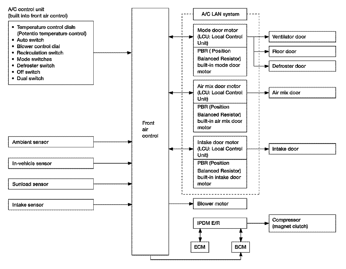 The control system consists of input sensors, switches, front air control and outputs. The relationship of these components is shown in the figure below:
