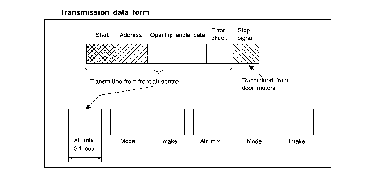Addresses, motor opening angle signals, motor stop signals and error checking messages are all transmitted through the data transmission lines connecting the front air control and each door motor.