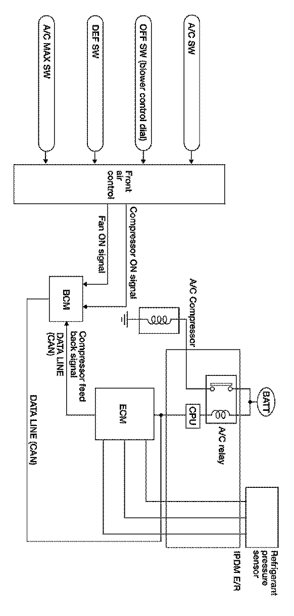 When A/C switch is pressed, or the defroster mode switch is pressed, the front air control transmits compressor ON and fan ON signals to the BCM. The BCM sends a compressor ON message to ECM, via CAN communication.