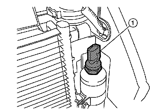 3.Disconnect the refrigerant pressure sensor connector and remove the refrigerant pressure sensor (1) from the liquid tank on the condenser.