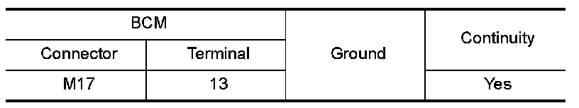 Check continuity between BCM harness connector and ground.