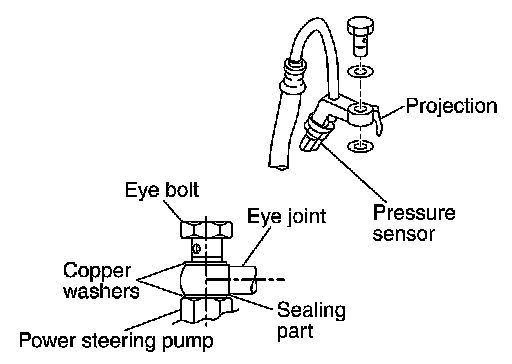 - Install eye-bolt with eye-joint (assembled to high-pressure hose) protrusion facing with pump side cutout, and then tighten it to the specified torque after tightening by hand.