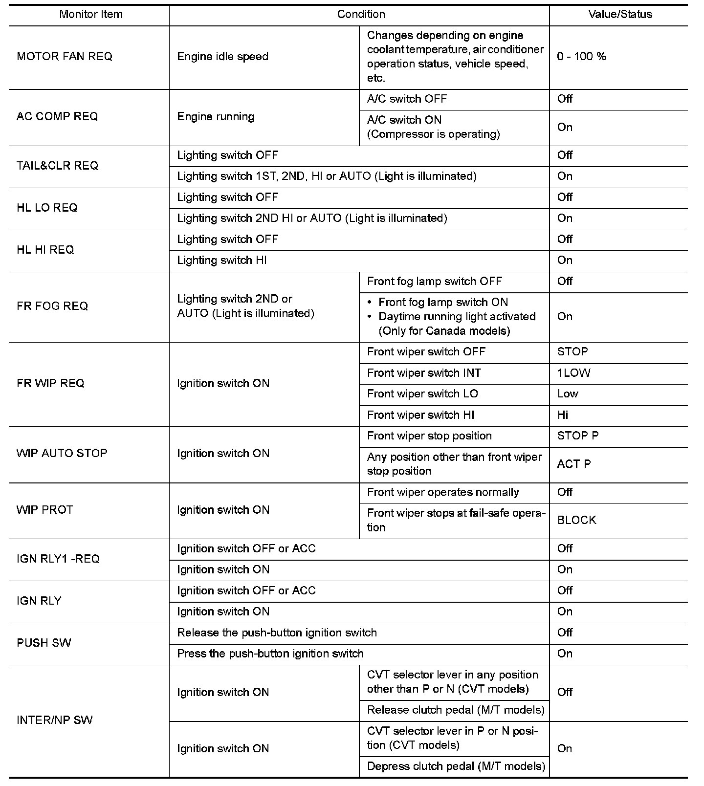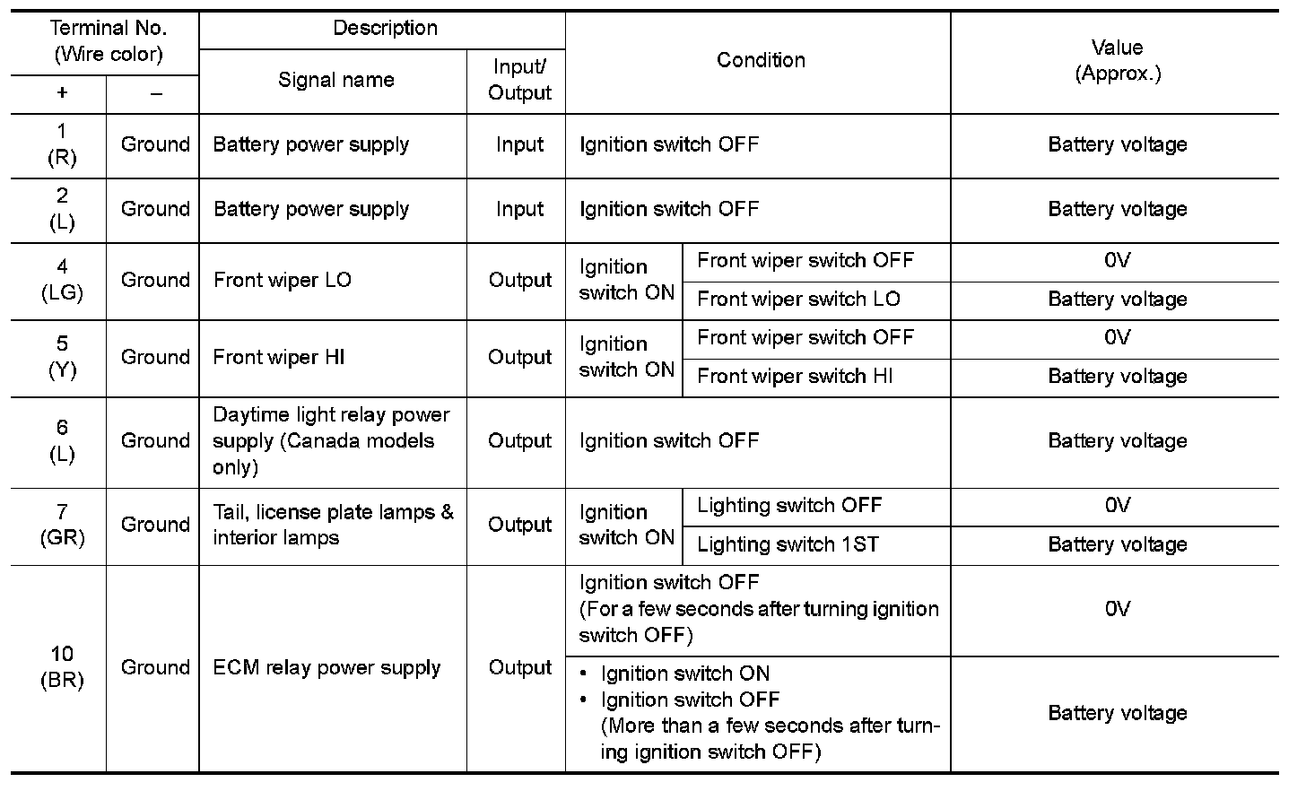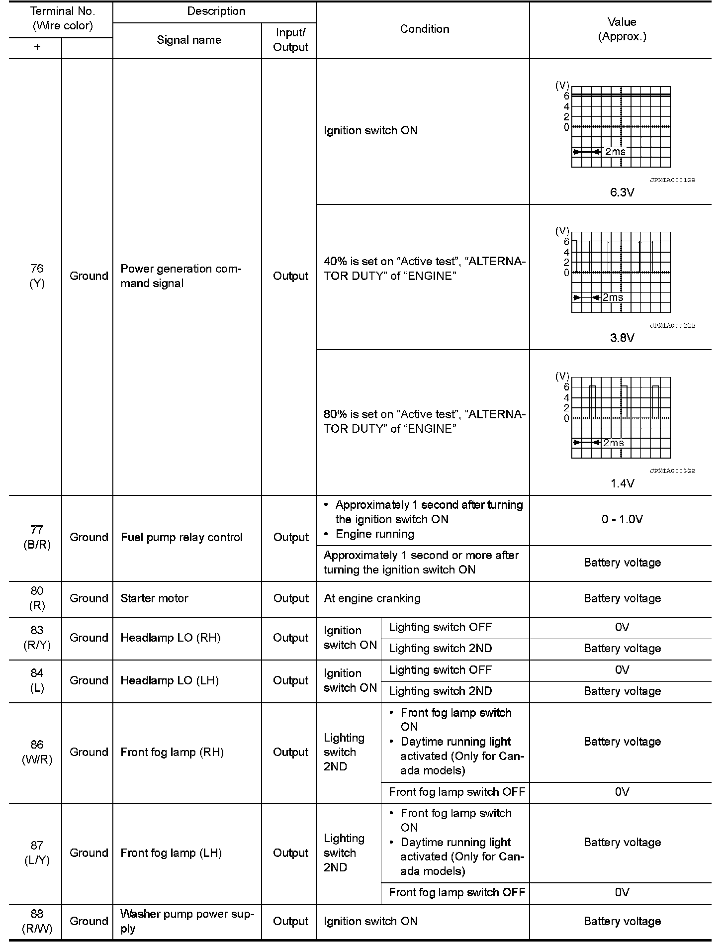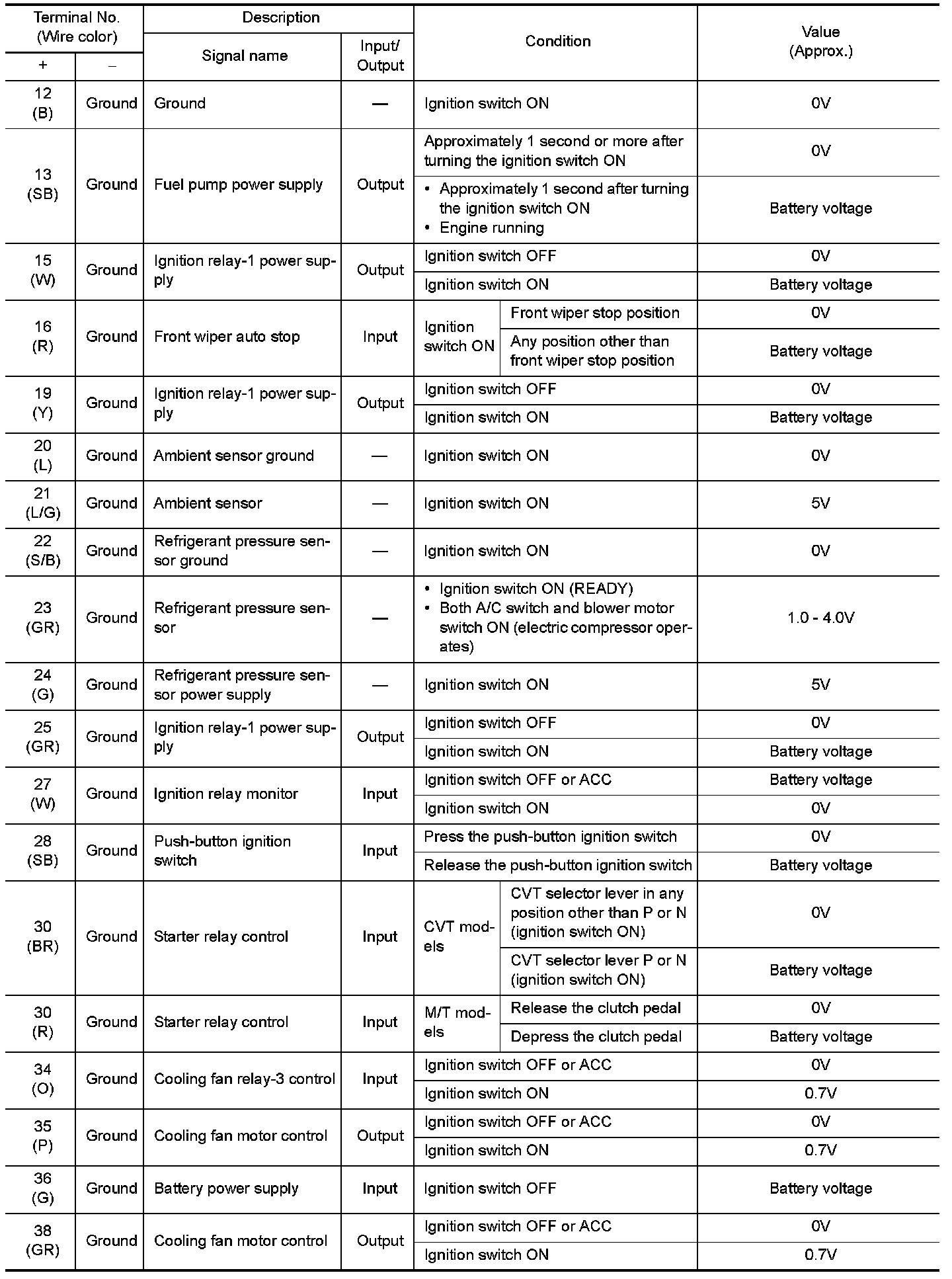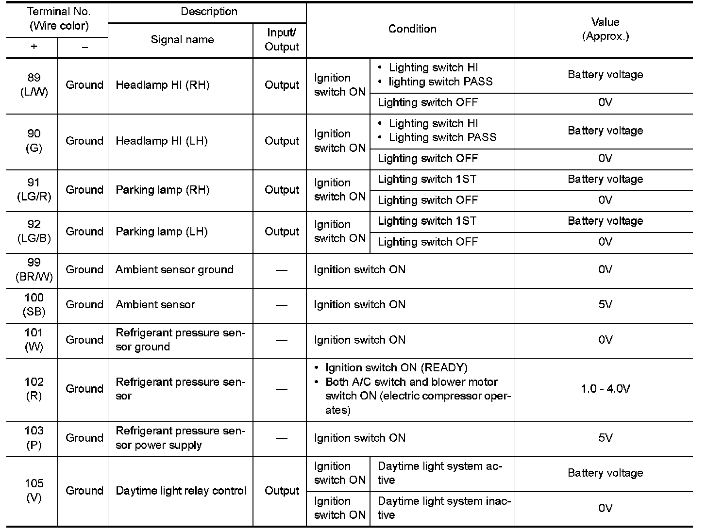 Pinout Values and Diagnostic Parameters
