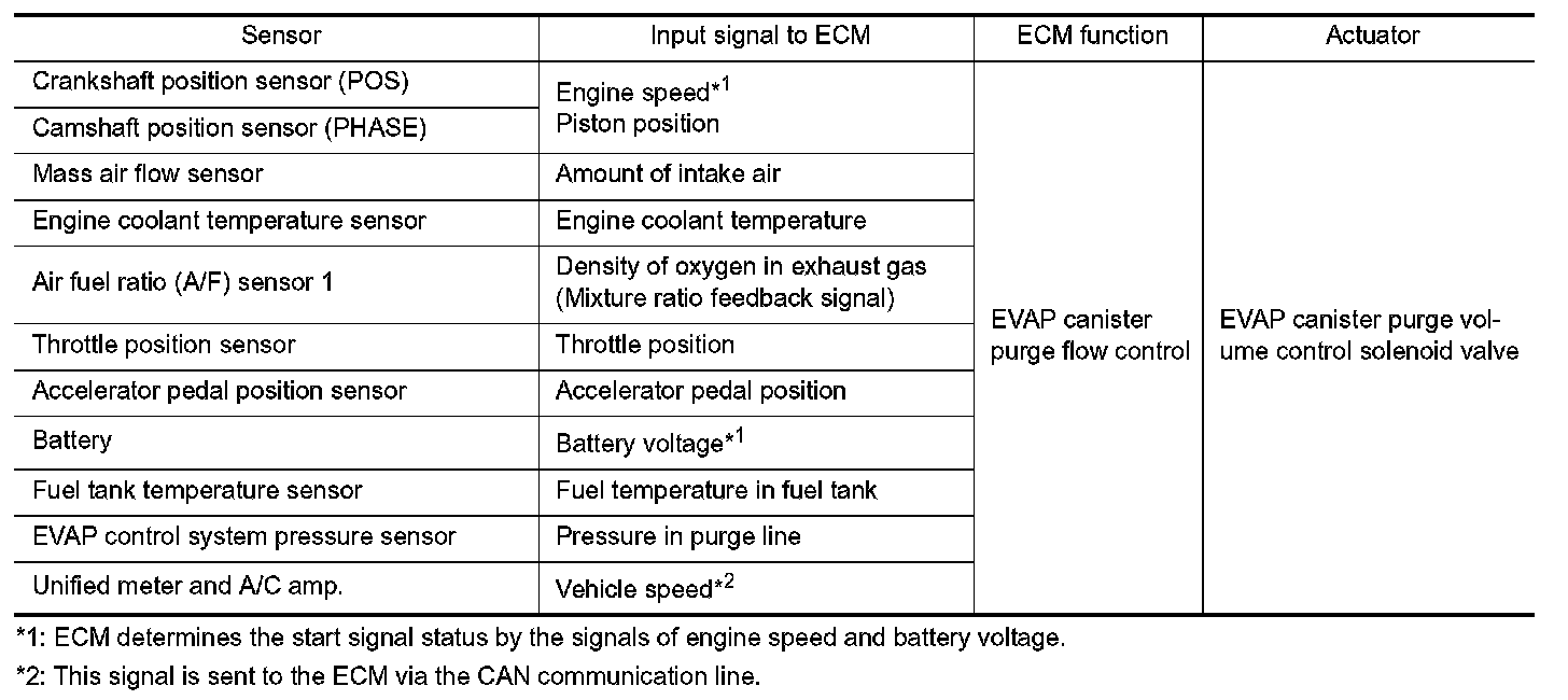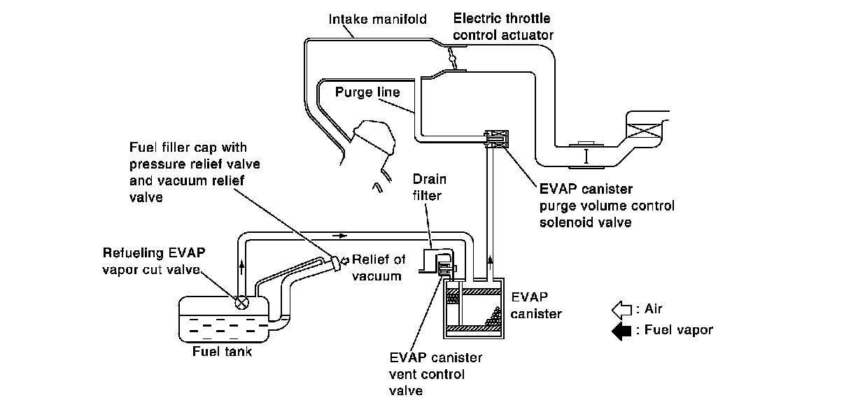 The vapor in the EVAP canister is purged by the air via the purge line to the intake manifold when the engine is operating. EVAP canister purge volume control solenoid valve is controlled by ECM. When the engine operates, the flow rate of vapor controlled by EVAP canister purge volume control solenoid valve is proportionally regulated as the air flow increases.