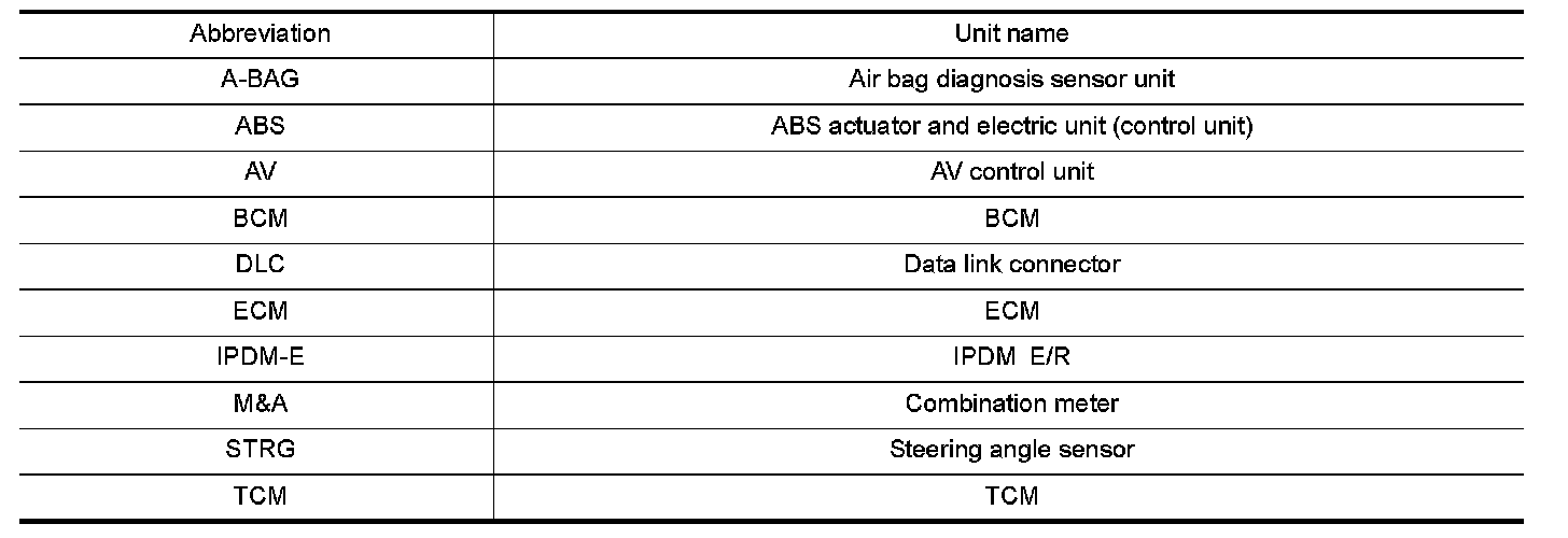 Unit name abbreviations in CONSULT CAN diagnosis and in this section are as per the following list.