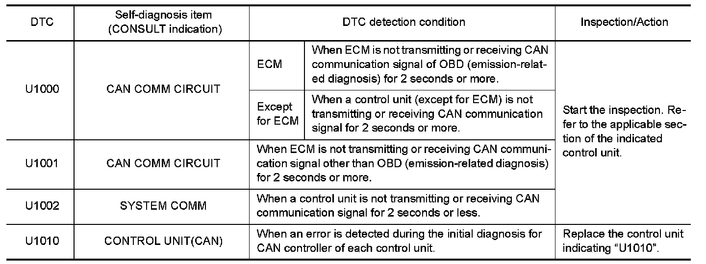 If communication signals cannot be transmitted or received among units communicating via CAN communication line, CAN communication-related DTC is displayed on the CONSULT "Self Diagnostic Result" screen.