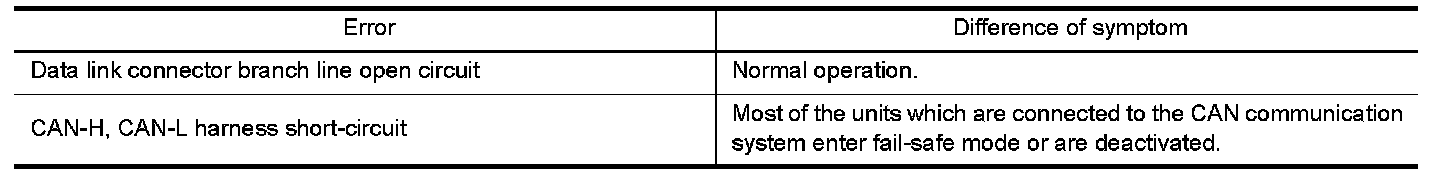 - When data link connector branch line is open, transmission and reception of CAN communication signals are not affected. Therefore, no symptoms occur. However, be sure to repair malfunctioning circuit.