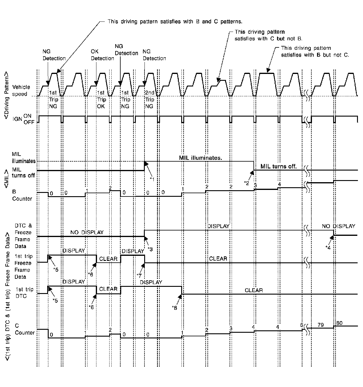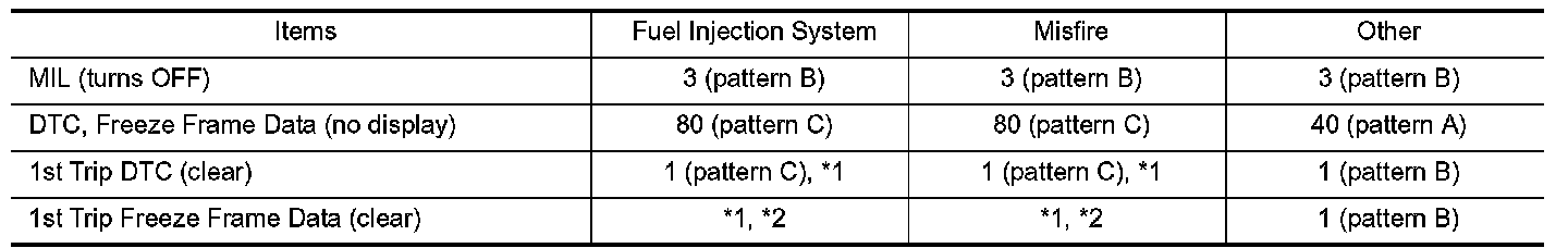 - The DTC and the freeze frame data will be stored until the vehicle is driven 40 times (driving pattern A) without the same malfunction recurring (except for Misfire and Fuel Injection System). For Misfire and Fuel Injection System, the DTC and freeze frame data will be stored until the vehicle is driven 80 times (driving pattern