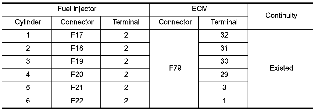 3.Check the continuity between fuel injector harness connector and ECM harness connector.