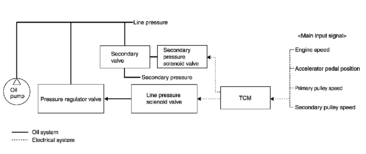 - When an input torque signal equivalent to the engine drive force is sent from the ECM to the TCM, the TCM controls the line pressure solenoid valve and secondary pressure solenoid valve.