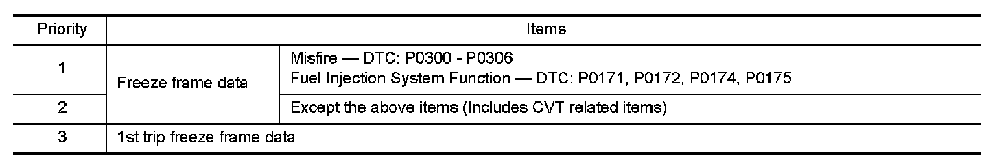 Only one set of freeze frame data (either 1st trip freeze frame data or freeze frame data) can be stored in the ECM. 1st trip freeze frame data is stored in the ECM memory along with the 1st trip DTC. There is no priority for 1st trip freeze frame data, and it is updated each time a different 1st trip DTC is detected. However, once freeze frame data (2nd trip detection/MIL on) is stored in the ECM memory, 1st trip freeze frame data is no longer stored. Remember, only one set of freeze frame data can be stored in the ECM. The ECM has the following priorities to update the data.