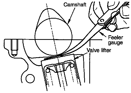 - Using a feeler gauge, measure the clearance between the valve lifter and camshaft.