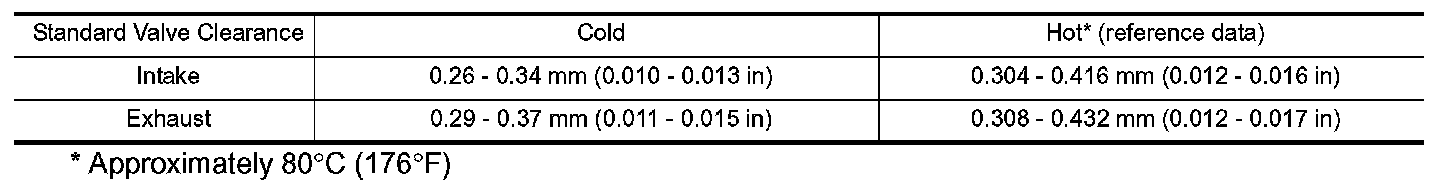 Exhaust: 0.29 - 0.37 mm (0.011 - 0.015 in)