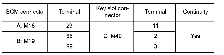 2.Check continuity between BCM connector and key slot connector.