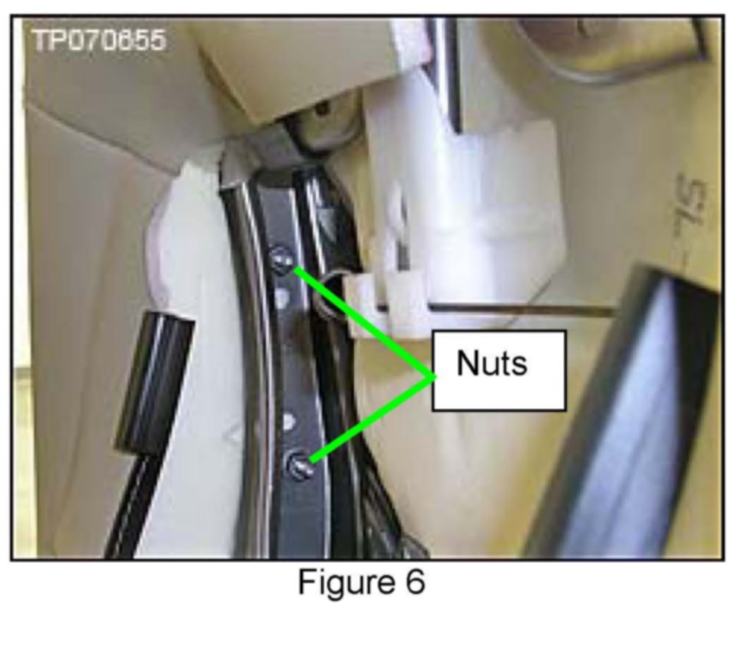 8. Locate and remove the 2 left side lumbar support assembly mounting bolts.