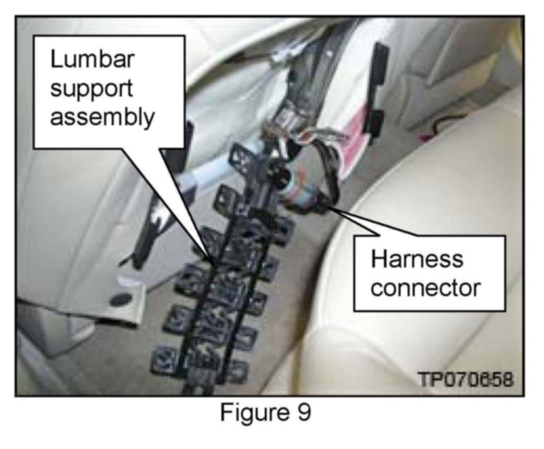 11. Recline the seatback far enough to access the 2 mounting screws on the right side of the lumbar support assembly.