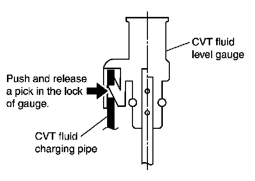 from the originally installed position, then securely push the CVT fluid level gauge until it meets the top end of the CVT fluid charging pipe.