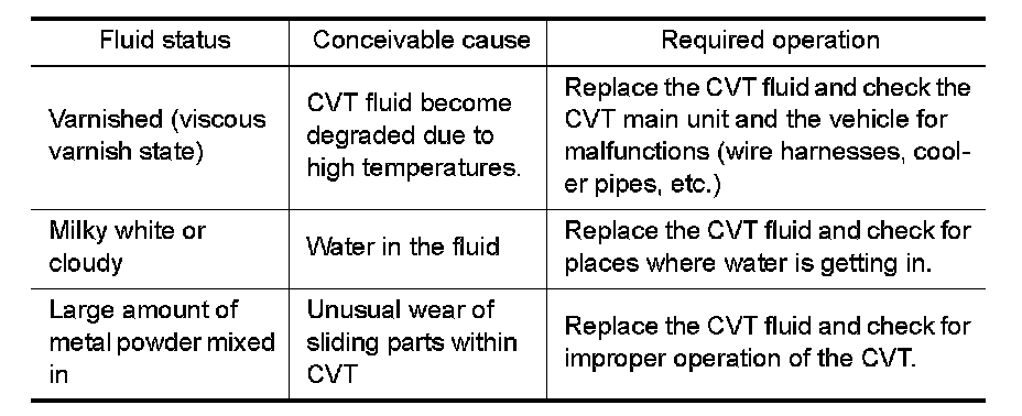 - If CVT fluid is very dark or smells burned, check operation of CVT.
