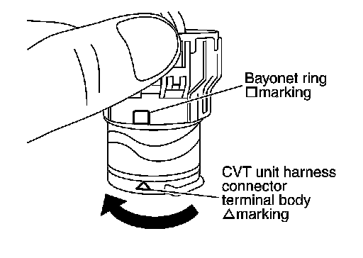 1.Align triangle marking on CVT unit harness connector terminal body with broken square marking on bayonet ring, insert CVT unit harness connector, and then rotate bayonet ring clockwise.