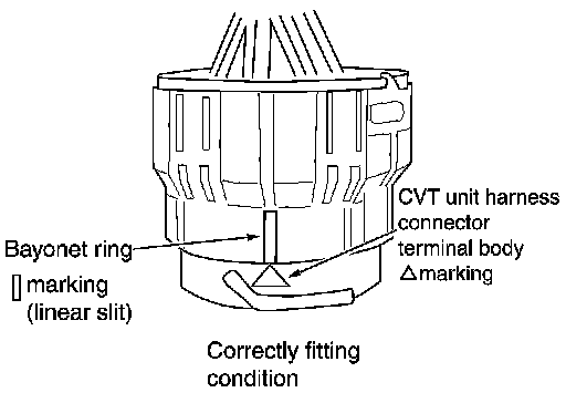 - Securely align triangle marking on CVT unit harness connector terminal body with bayonet ring slit. Then, be careful not to make a half fit condition as shown in the figure.