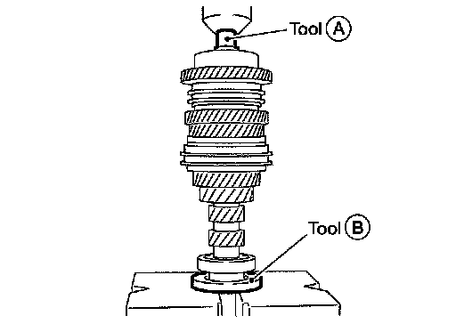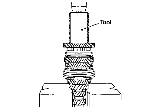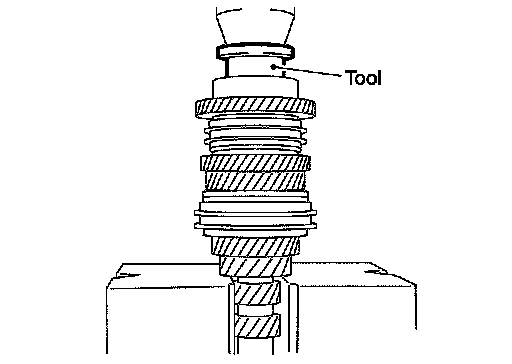 14.Install 6th needle bearing, 6th input gear, 6th Baulk ring onto 6th input gear bushing and then press in 6th input gear bushing onto input shaft using Tool.