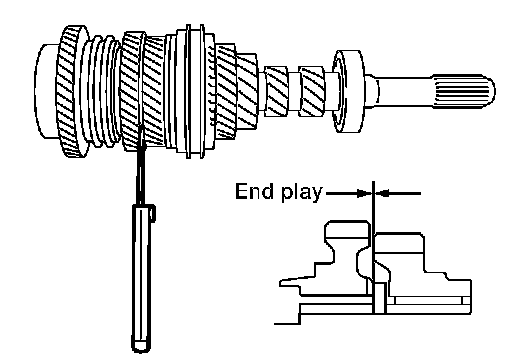 15.Install snap ring onto input shaft and make sure that end play (gap between snap ring and groove) of 6th input gear bushing satisfies the standard value.