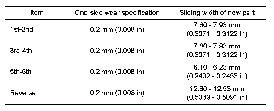 - Check if the width of shift fork hook (sliding area with coupling sleeve) is within allowable specification below.