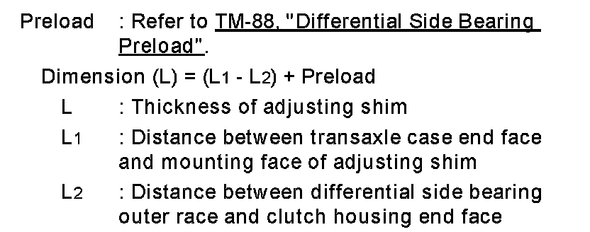 - Calculate dimension (L) (thickness of adjusting shim) using the following procedure to satisfy specification of preload for differential side bearing.