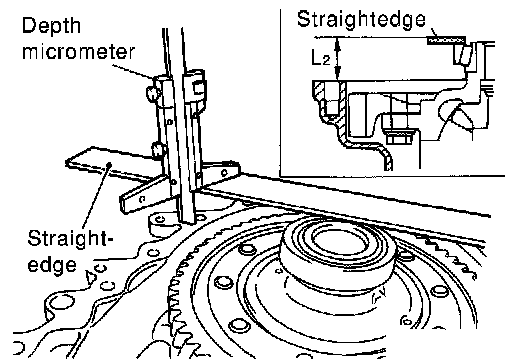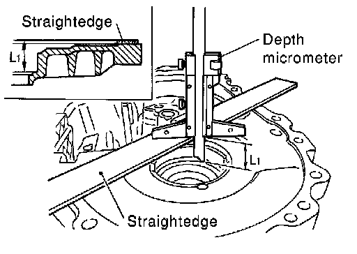 - When adjusting differential side bearing preload, select adjusting shim for differential side bearing. To select adjusting shim, measure clearance (L) between transaxle case and differential side bearing outer race.