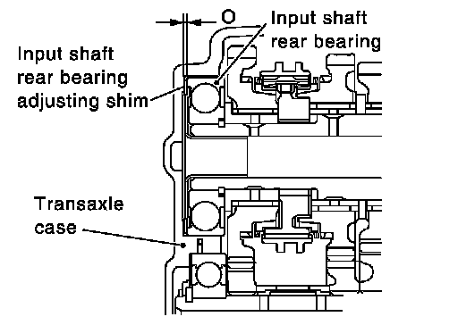 - When adjusting input shaft end play, select adjusting shim for input shaft rear bearing. To select adjusting shim, measure clearance between transaxle case and input shaft rear bearing.