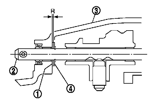 - When adjusting striking rod end play, select adjusting shim (1) for striking rod (2). To select adjusting shim, measure clearance between transaxle case (3) and striking rod shim (4).