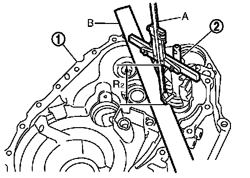 c.With shifter lever A (1) held in the position shown, temporarily assemble transaxle case to clutch housing.
