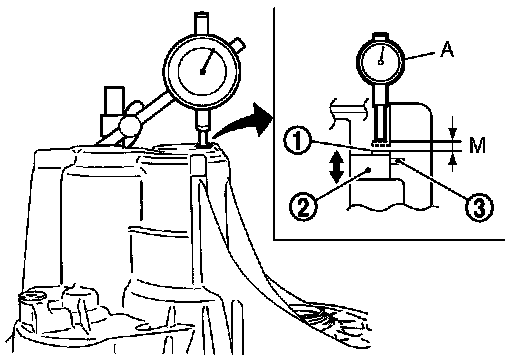 5.Set the dial indicator (A) to dummy adjusting shim (1) through the bore plug hole.