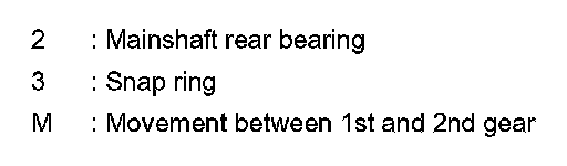 - When adjusting mainshaft end play, select adjusting shim (1) for mainshaft rear bearing (2). To select adjusting shim, measure clearance (M) between transaxle case (3) and dummy adjusting shim (4) on mainshaft rear bearing.