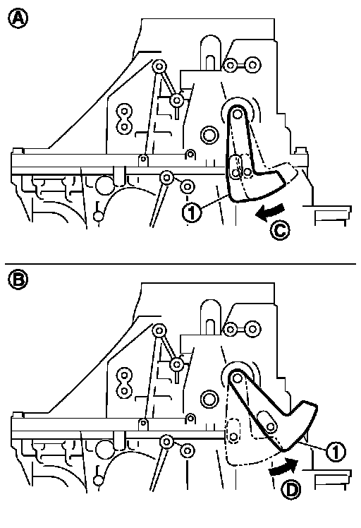 a.Shift the shifter lever A (1) to 2nd gear position (A), and then rotate it in the direction of the arrow (C) until it stops. Using this position as the reference point, measure the amount of movement when shifting shifter lever A to 1st gear position (B) and rotating it in the direction of the arrow (D) until it stops. This measurement is the (M) dimension.