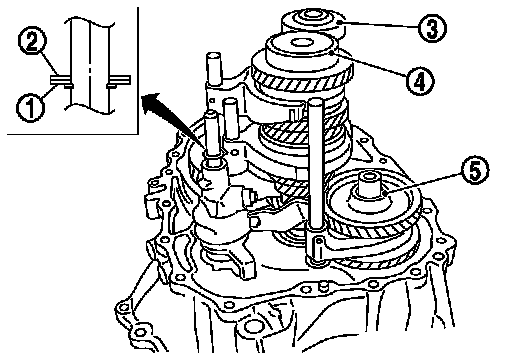 18.Remove striking rod shim (1), striking rod adjusting shim (2), mainshaft rear bearing adjusting shim (3), input shaft rear bearing adjusting shim (4), and reverse idler gear adjusting shim (5).