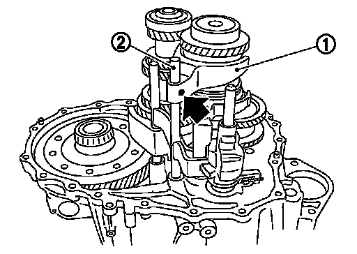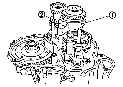 25.Pull out 5th-6th shift fork (1) and 5th-6th fork rod (2).