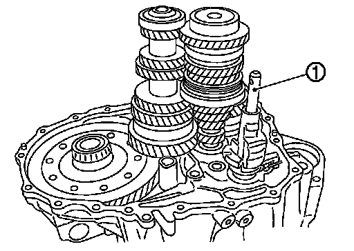 19.Remove retaining pin of reverse shift fork (1) using suitable tool.
